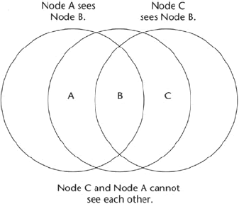 This technique works great for wired LANs, but wireless topologies can create a problem for CSMA/CD. This problem is known as the hidden node problem. The hidden node problem is shown in Figure 7.
